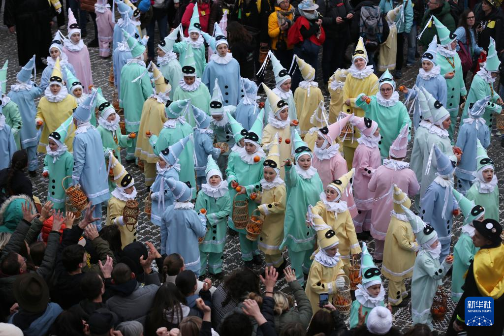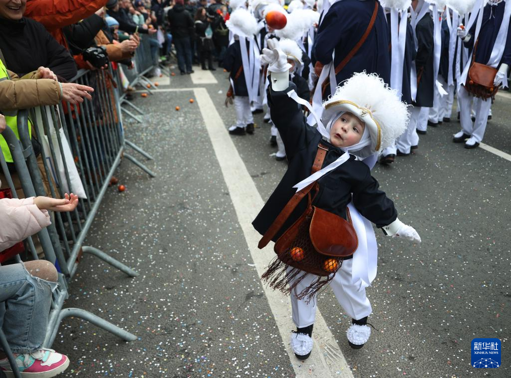 2月13日,在比利时南部小镇班什,装扮成“农夫”形象的小朋友将血橙扔向游客。据说,血橙代表祝福,接到或被扔到的人都会交好运。