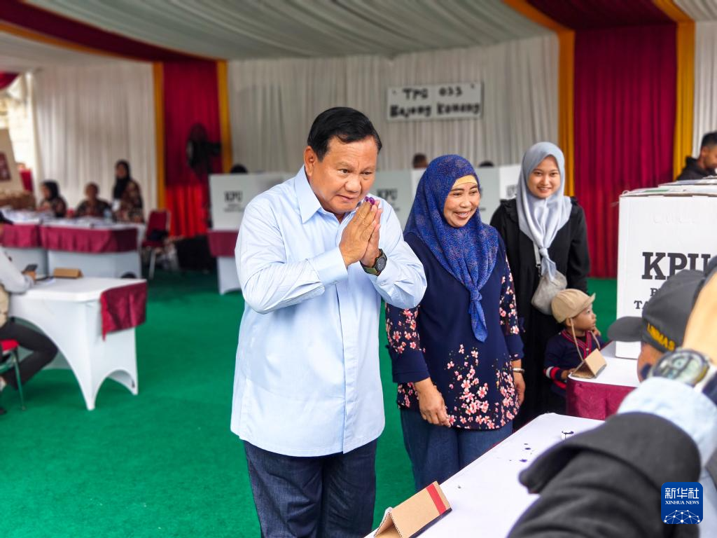 2月14日,总统候选人、现任国防部长普拉博沃·苏比安托(左)在位于印度尼西亚茂物的一处投票站向工作人员致意(手机照片)。