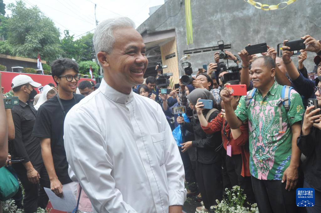 2月14日,在印度尼西亚三宝垄,总统候选人、中爪哇省前省长甘贾尔·普拉诺沃来到投票站投票。