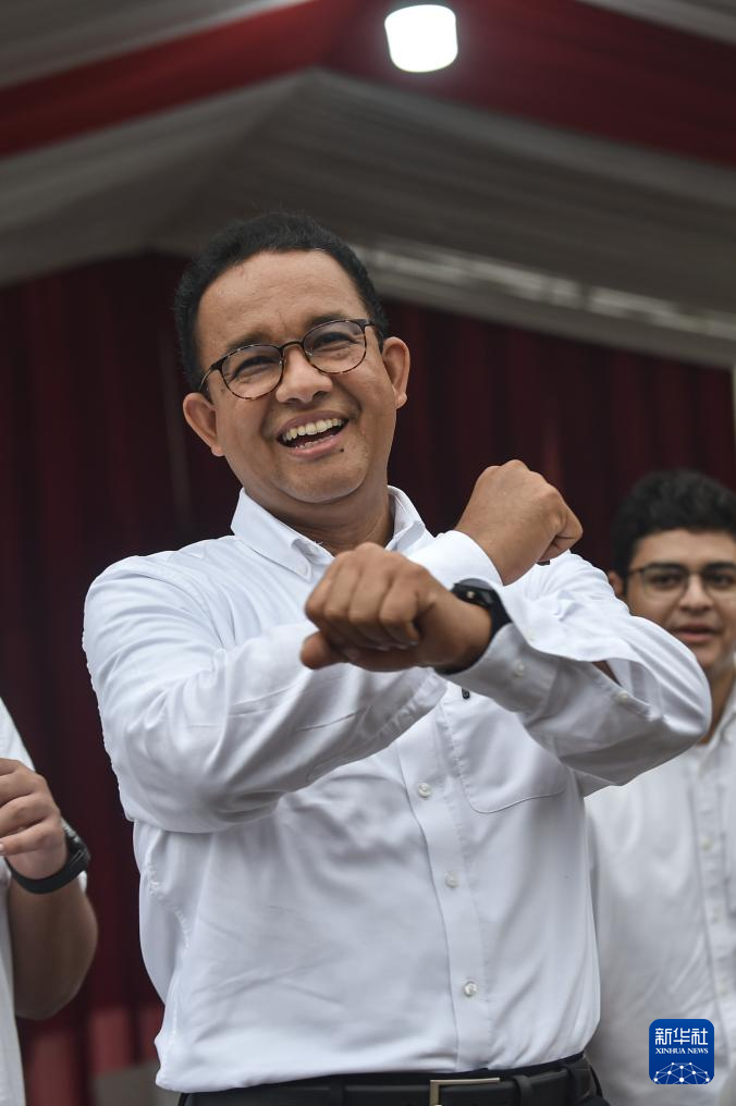 2月14日,在印度尼西亚雅加达,总统候选人、雅加达首都特区前省长阿尼斯·巴斯维丹投票后面带笑容。