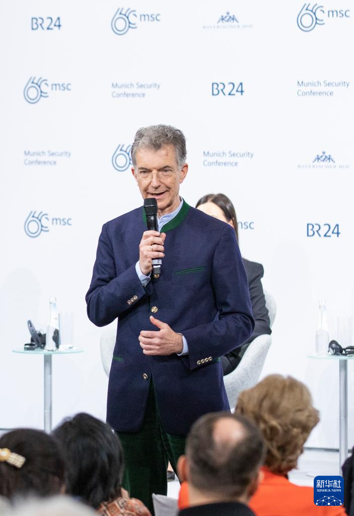 2月18日,慕安会主席克里斯托夫·霍伊斯根(左二)在德国慕尼黑举行的第60届慕尼黑安全会议上发表闭幕致辞。