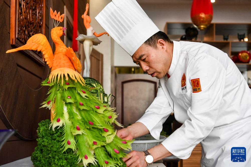 2月20日,厨师在俄罗斯莫斯科举行的“珍奇辽味”走进俄罗斯活动上制作“孔雀迎宾”食雕。