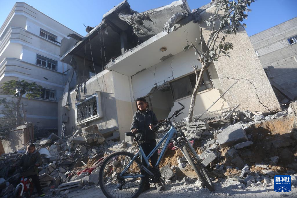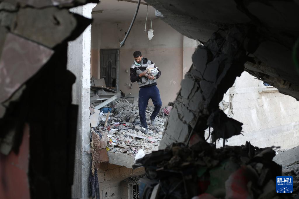 2月21日,在加沙地带南部城市拉法,巴勒斯坦少年经过以军空袭后的废墟。