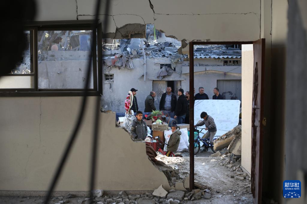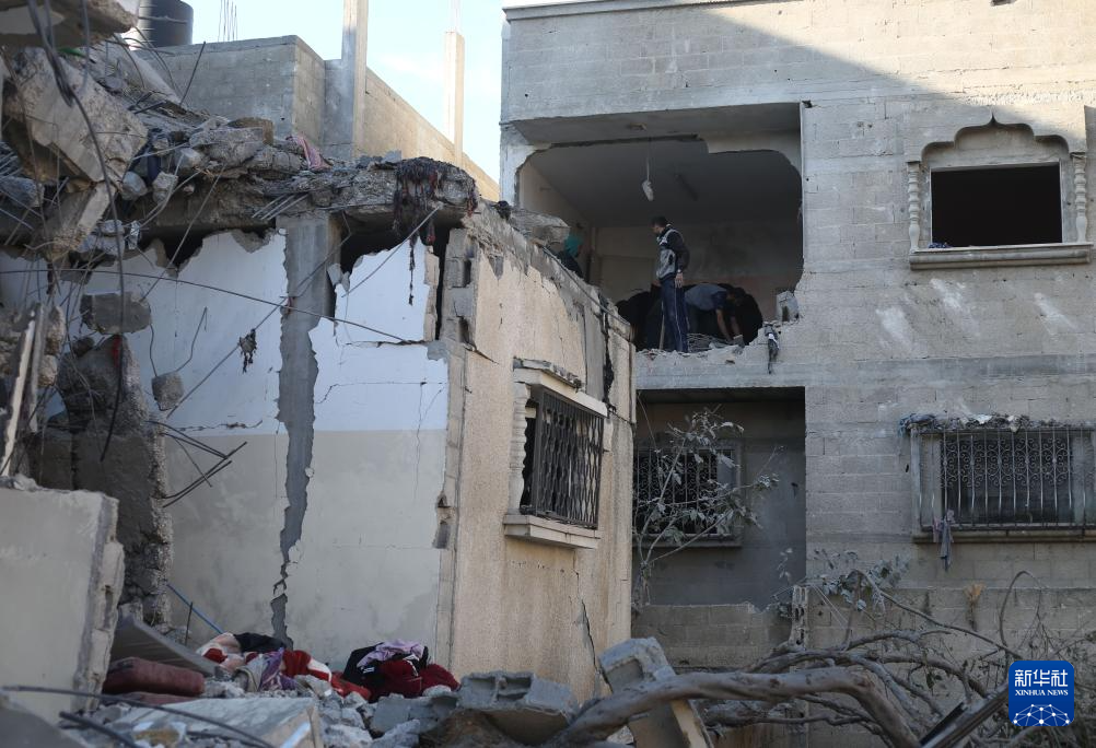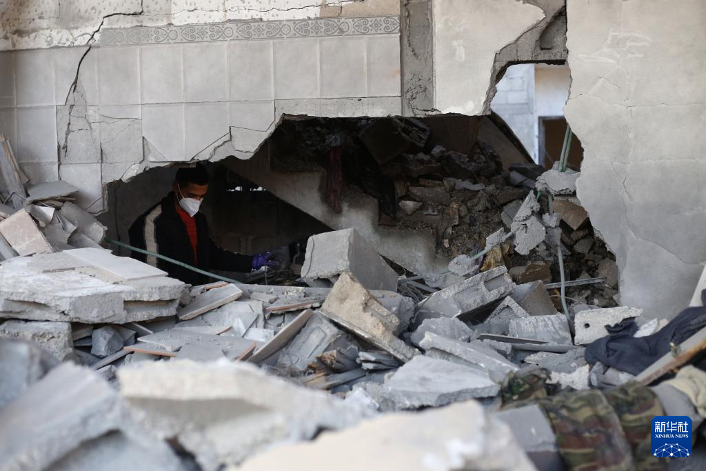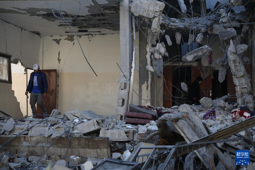 2月21日,在加沙地带南部城市拉法,巴勒斯坦人查看以军空袭后的废墟。