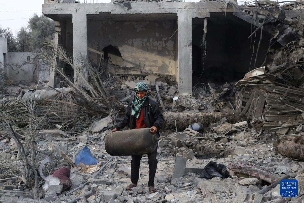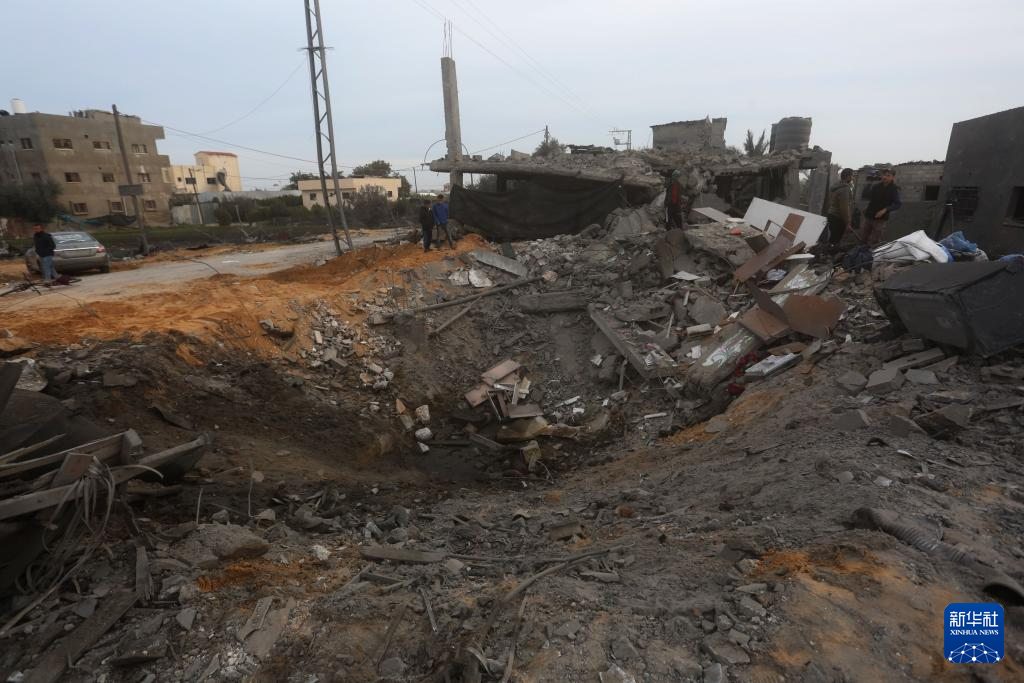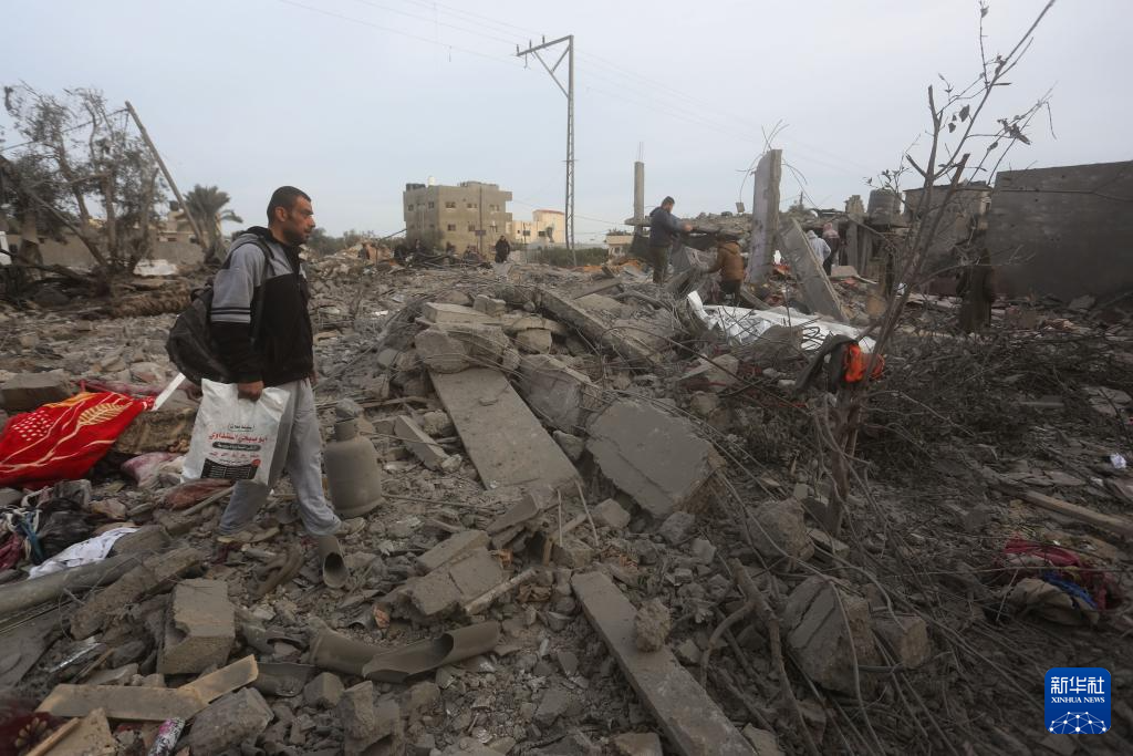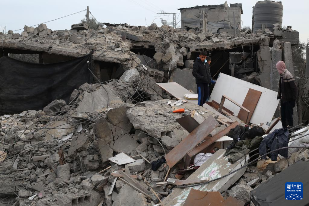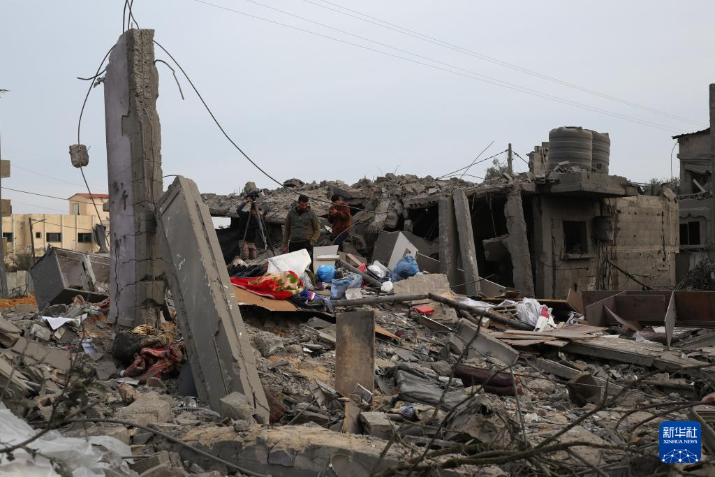 2月23日,在加沙地带南部城市拉法,巴勒斯坦人查看以军空袭后的废墟。