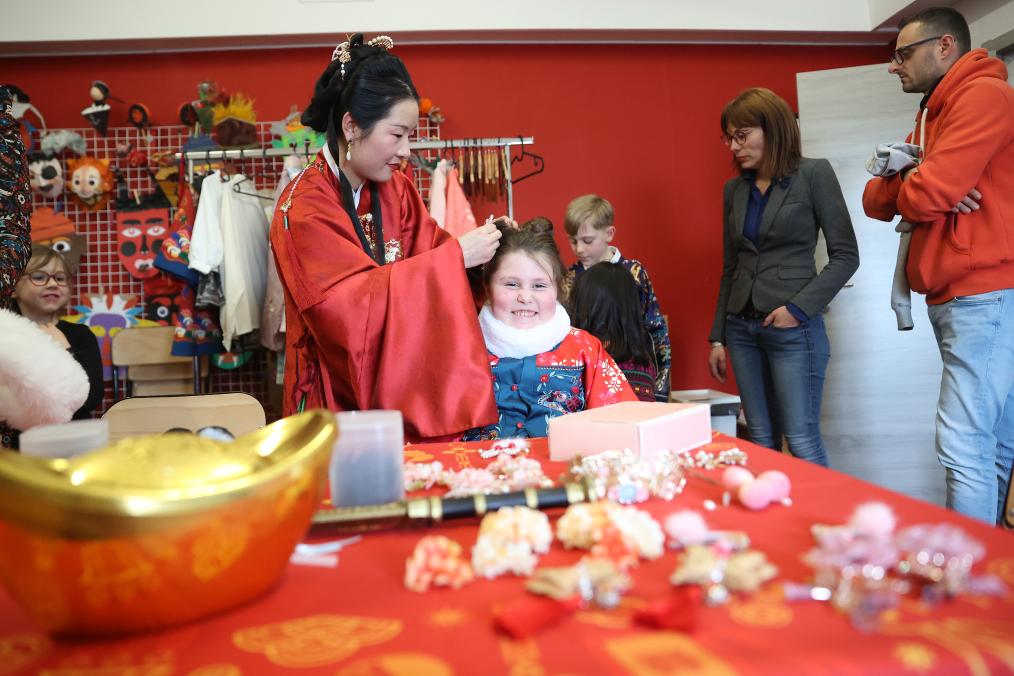 2月24日,小朋友在比利时班什举行的“金龙迎新——2024比利时生肖设计展”期间体验汉服妆造。(新华社记者赵丁喆摄)