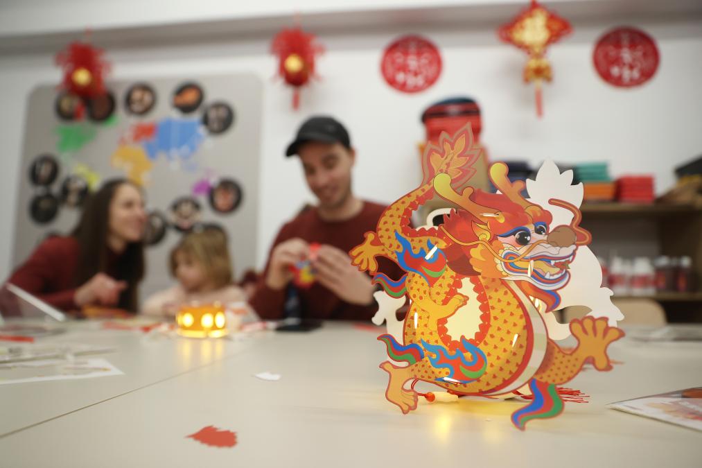 2月24日,人们在比利时班什举行的“金龙迎新——2024比利时生肖设计展”期间体验制作龙形灯笼。(新华社记者赵丁喆摄)