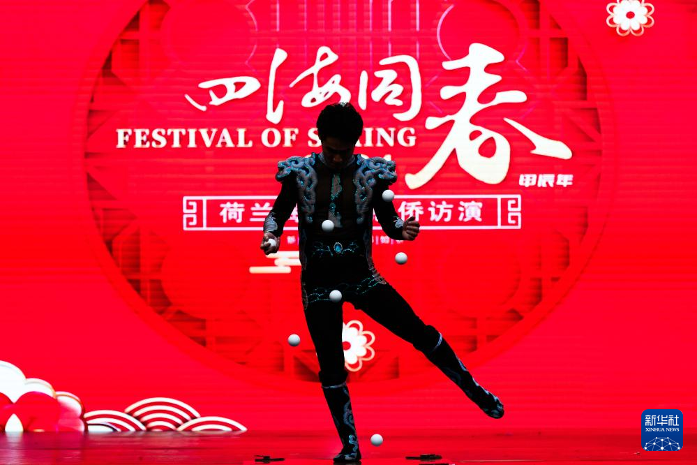 2月24日,演员在荷兰海牙举行的“四海同春”慰侨访演活动上表演杂技。新华社记者 孟鼎博 摄