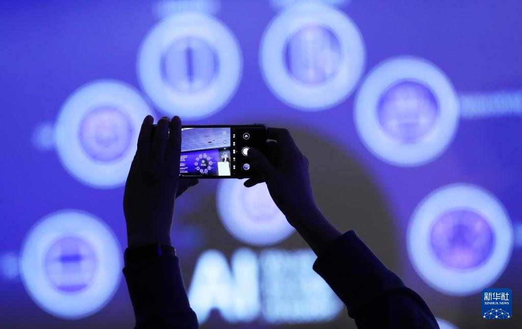 2月27日,在西班牙巴塞罗那举行的2024年世界移动通信大会上,与会者在“算力网络:智能网络赋能智慧世界”专题论坛上拍摄关于AI内容的幻灯片。