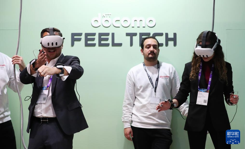2月26日,人们在西班牙巴塞罗那举行的2024年世界移动通信大会上参观体验。