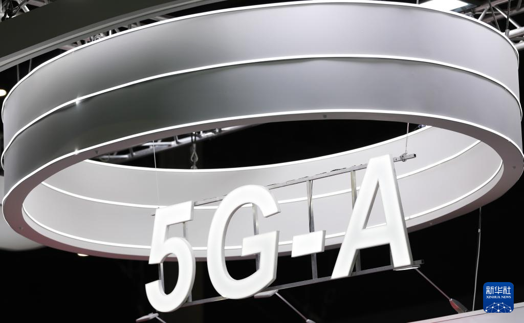 这是2月29日在西班牙巴塞罗那举行的2024年世界移动通信大会上拍摄的5G-A的标识。