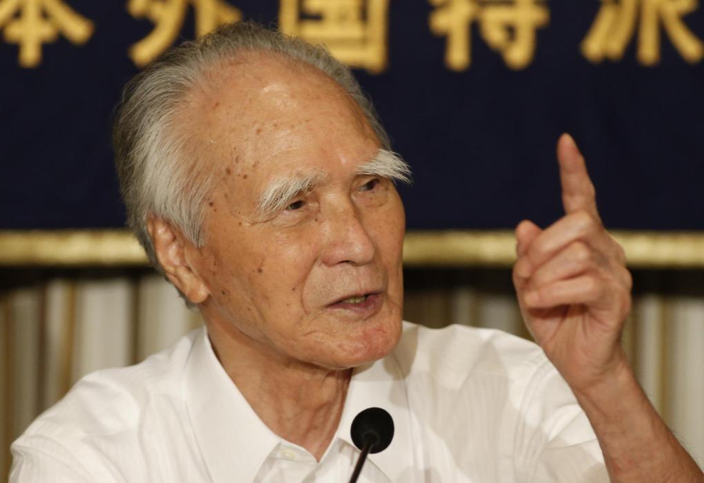2015年7月23日,在日本东京,日本前首相村山富市(中)发表演讲。新华社记者刘天摄