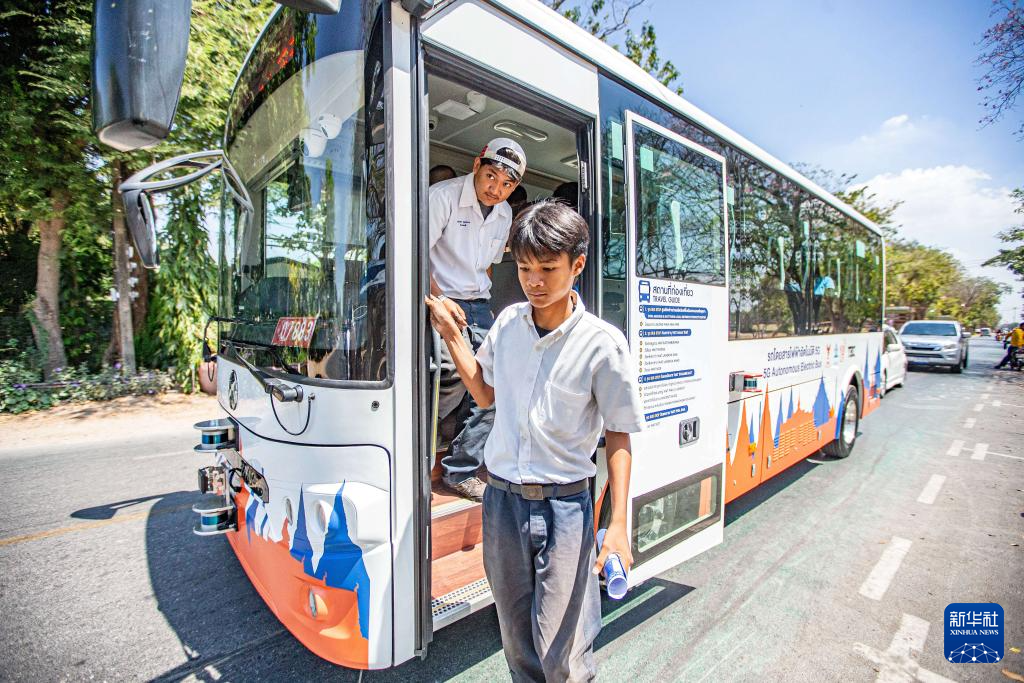 3月5日,在泰国大城府,乘客走下5G无人驾驶电动巴士。