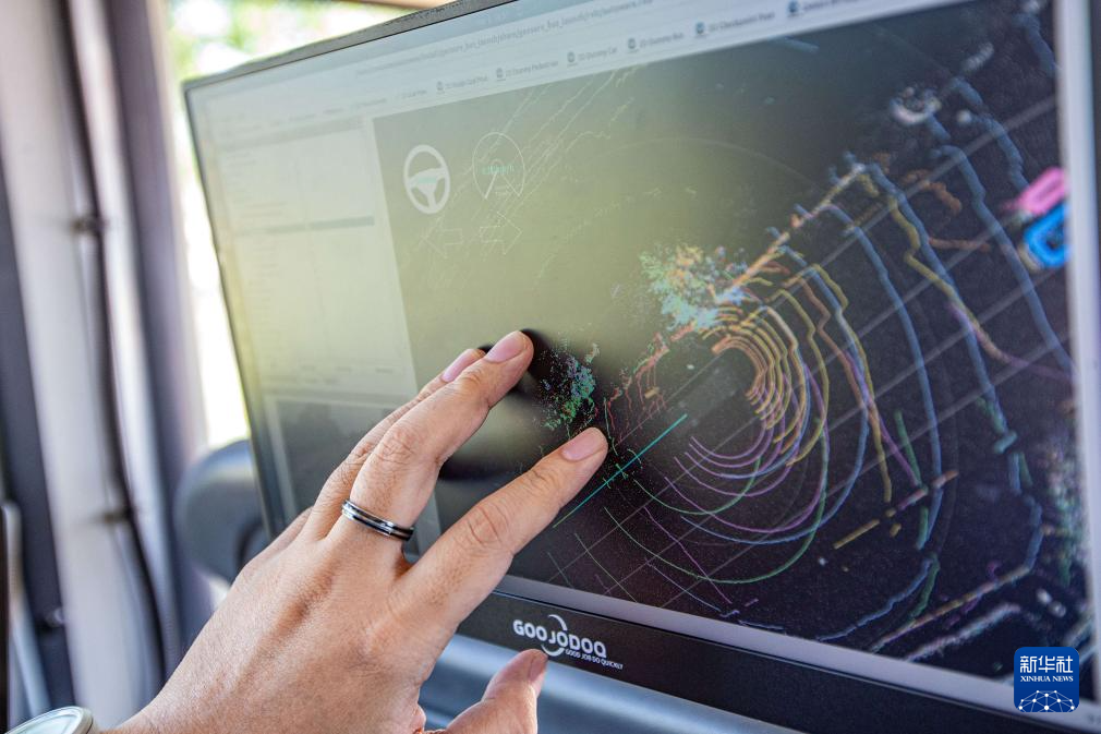 3月5日,在泰国大城府,工作人员在5G无人驾驶电动巴士上展示雷达图。