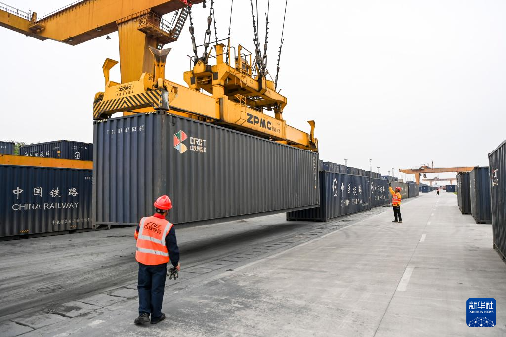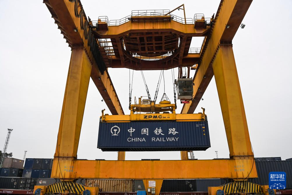 3月8日,在南宁国际铁路港,工作人员在吊装集装箱。