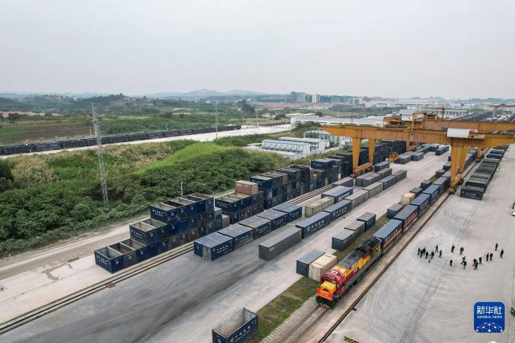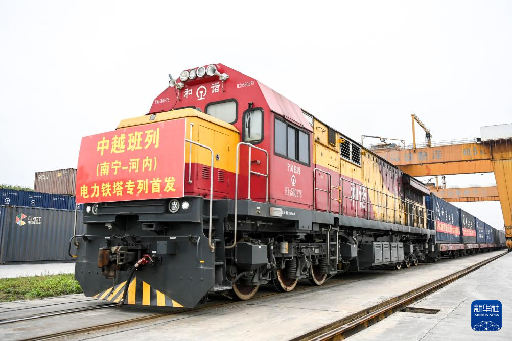 3月8日上午,一列满载340吨电力铁塔的中越班列从广西南宁国际铁路港开出,发往越南河内。这是广西首次开行电力铁塔专列。