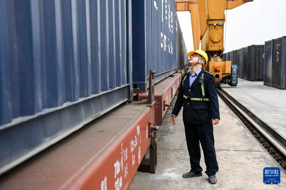 3月8日,在南宁国际铁路港,工作人员在检查集装箱。