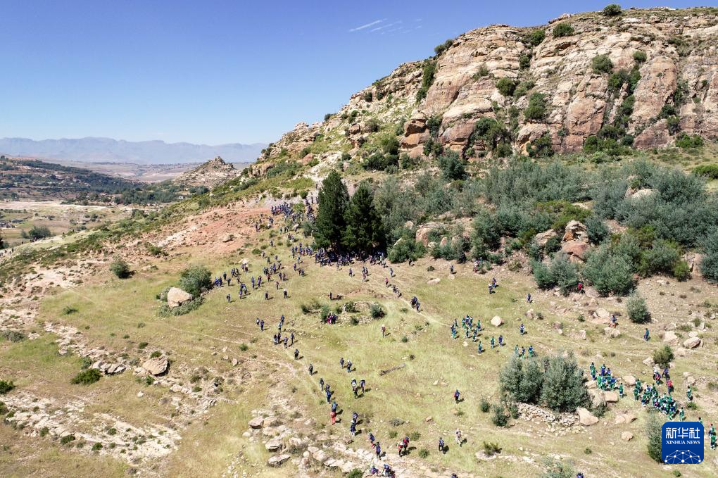 3月7日,在莱索托蒙华宁,民众参加莫舒舒徒步活动(无人机照片)。