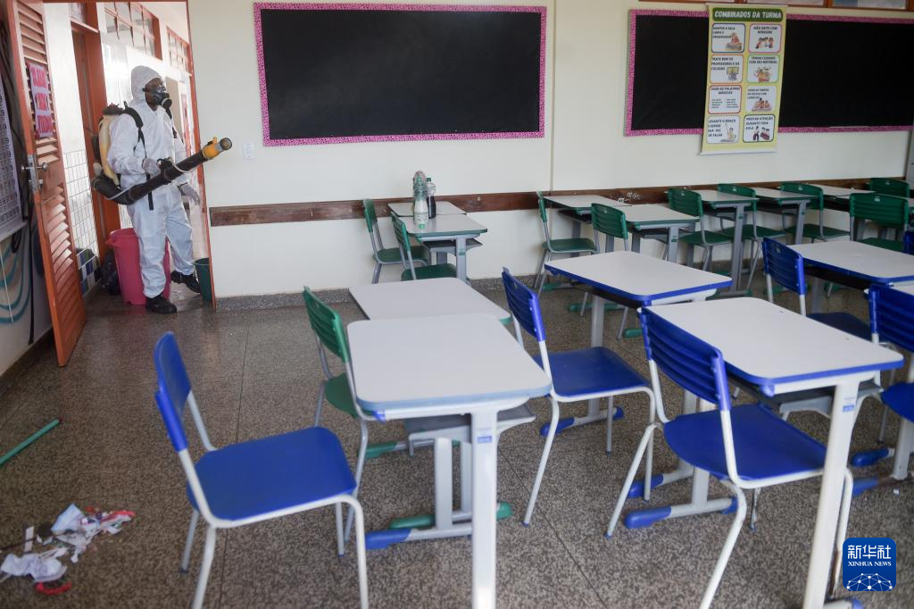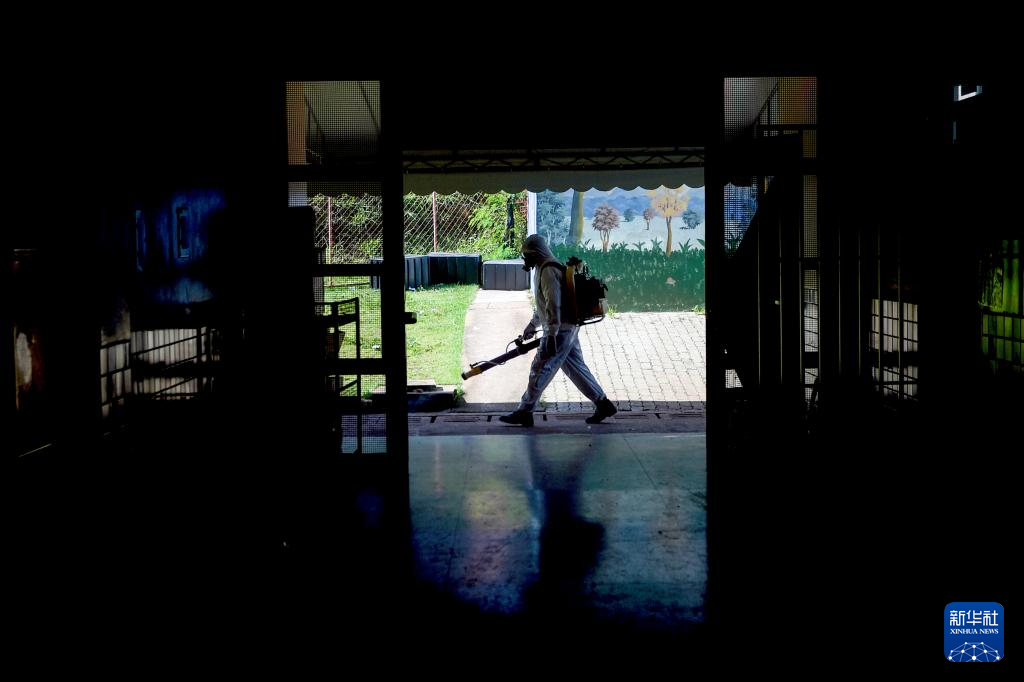 3月9日,在巴西首都巴西利亚一所学校内,公共卫生人员喷洒灭蚊剂。
