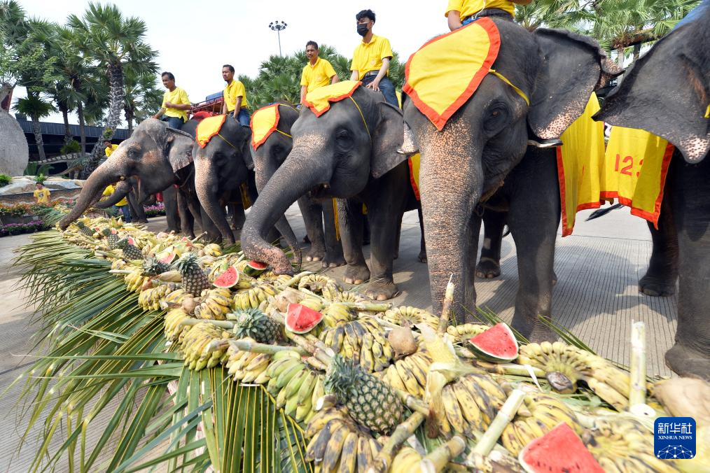 3月13日,在泰国芭堤雅东芭乐园,大象享用水果自助餐。