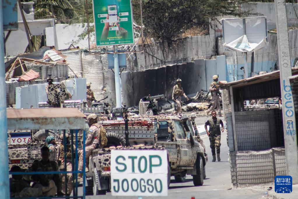 3月15日,在索马里摩加迪沙,安全人员封锁袭击现场附近的道路。