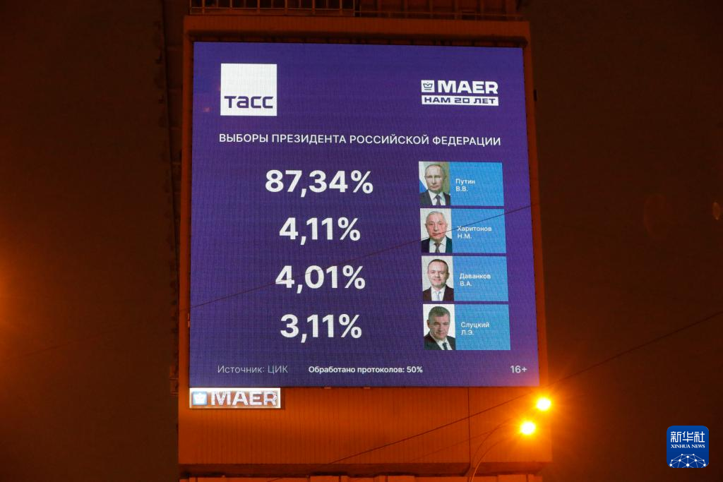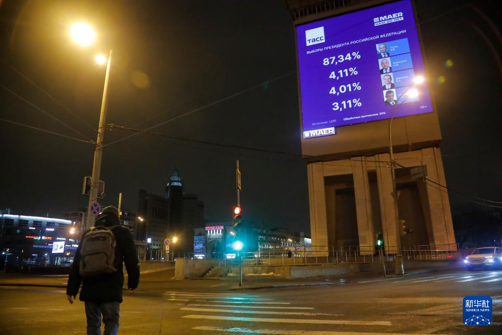 这是3月17日在俄罗斯首都莫斯科街头拍摄的屏幕上的总统选举实时统计数据。