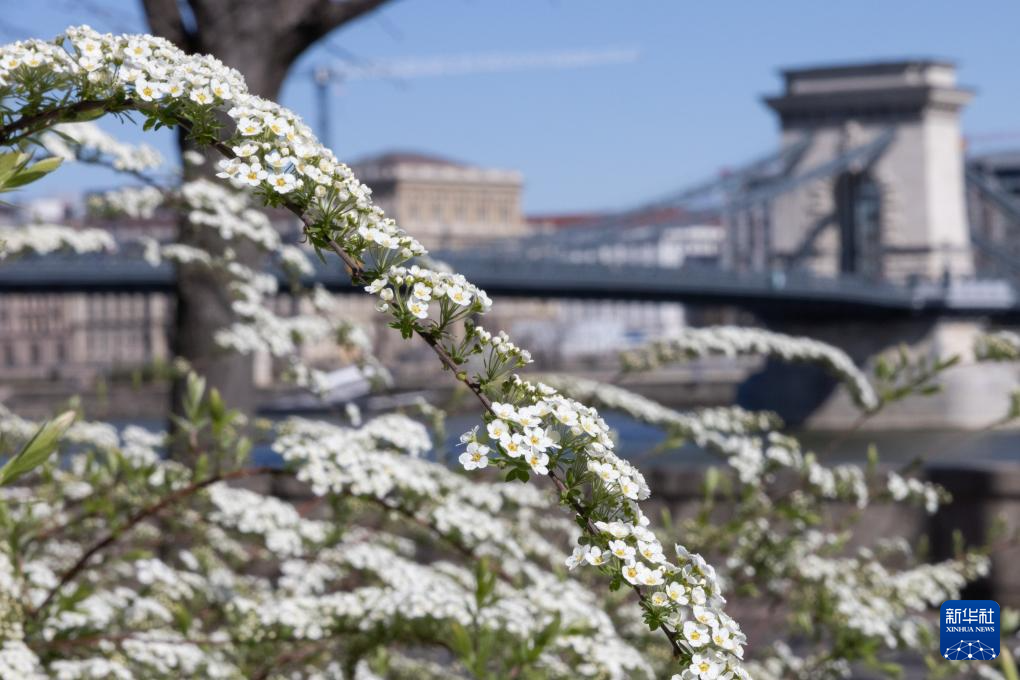3月17日,匈牙利布达佩斯链子桥前鲜花盛开。
