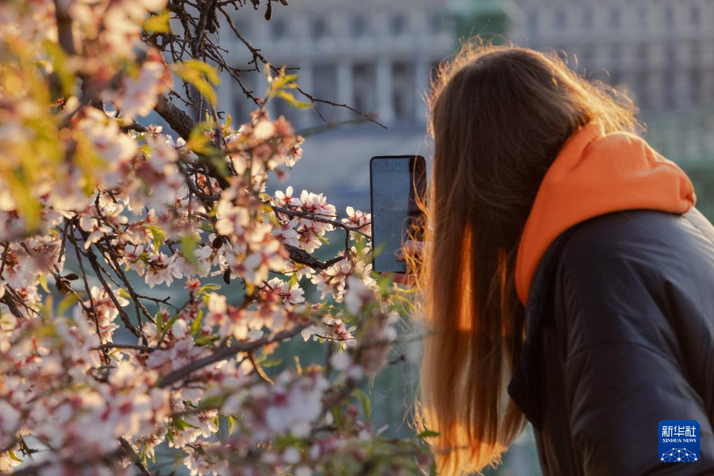 3月17日,在匈牙利布达佩斯,一名女子拍摄盛开的鲜花。