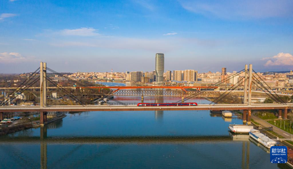 2024年3月6日,一列旅客车运行在匈塞铁路塞尔维亚境内贝诺段的贝尔格莱德萨瓦河大桥上(无人机照片)。