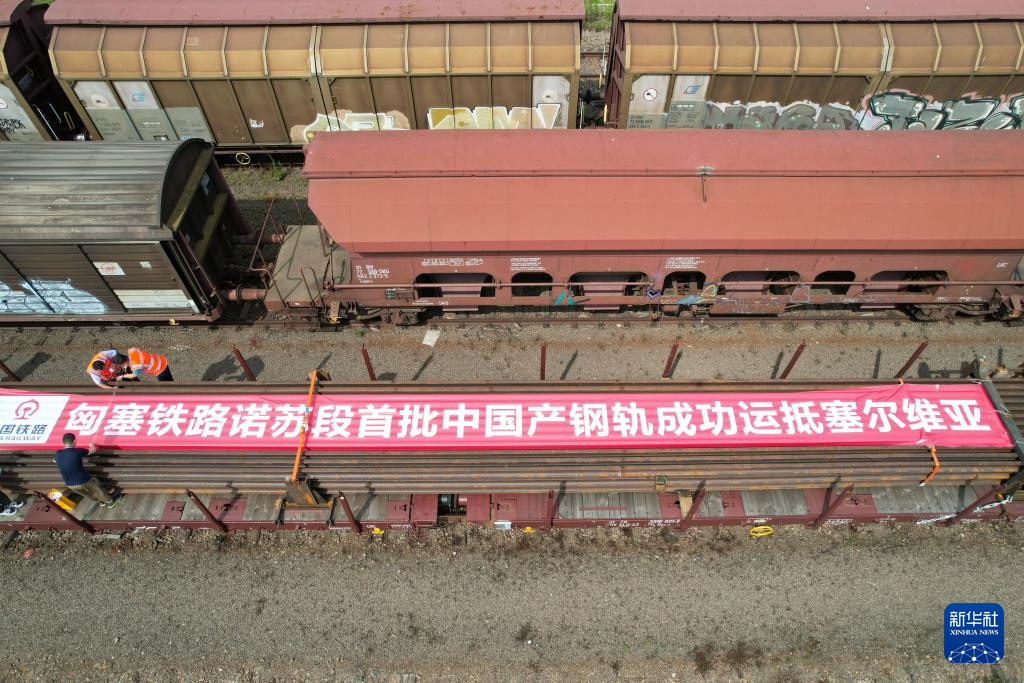 2023年6月14日,匈塞铁路塞尔维亚境内诺苏段首批中国产钢轨运抵塞尔维亚(无人机照片)。