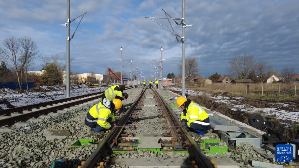 2024年1月17日,匈塞铁路塞尔维亚境内诺苏段一处建设现场,铁路建设者对建设中的线路进行精调。