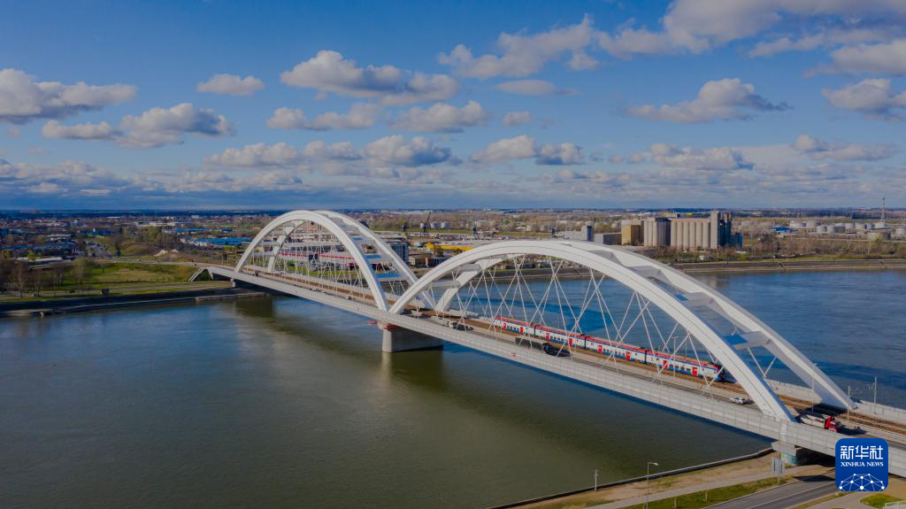 2024年3月12日,一列火车运行在匈塞铁路塞尔维亚境内贝诺段诺维萨德多瑙河大桥上(无人机照片)。
