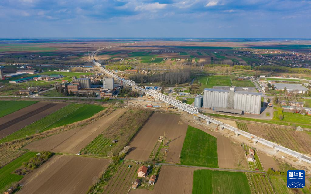 这是2024年3月15日拍摄的匈塞铁路塞尔维亚境内建设中的维尔巴斯特大桥(无人机照片)。