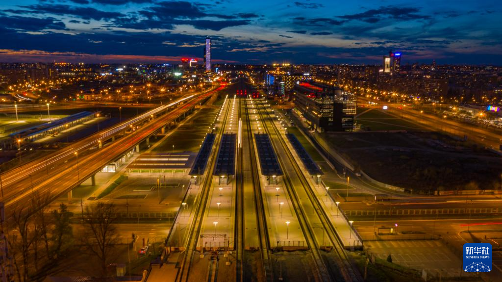 这是2024年3月17日傍晚拍摄的夜色中的匈塞铁路塞尔维亚境内贝诺段新贝尔格莱德站(无人机照片)。