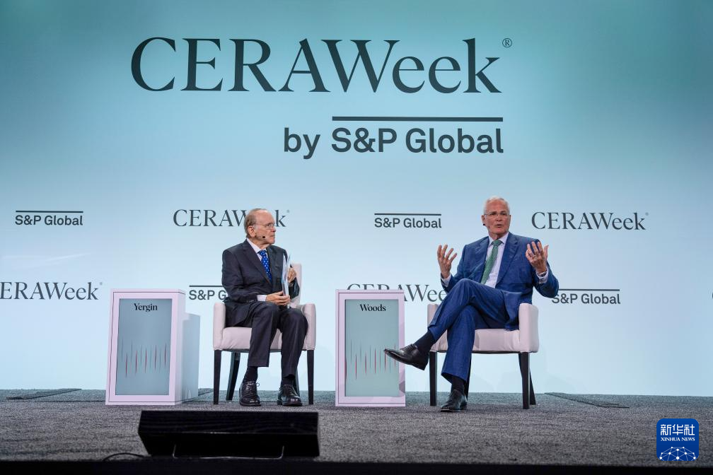 3月18日,标普全球公司副主席丹尼尔·耶金(左)和埃克森美孚首席执行官达伦·伍兹在美国休斯敦举行的能源界高端会议“剑桥能源周”上分享观点。