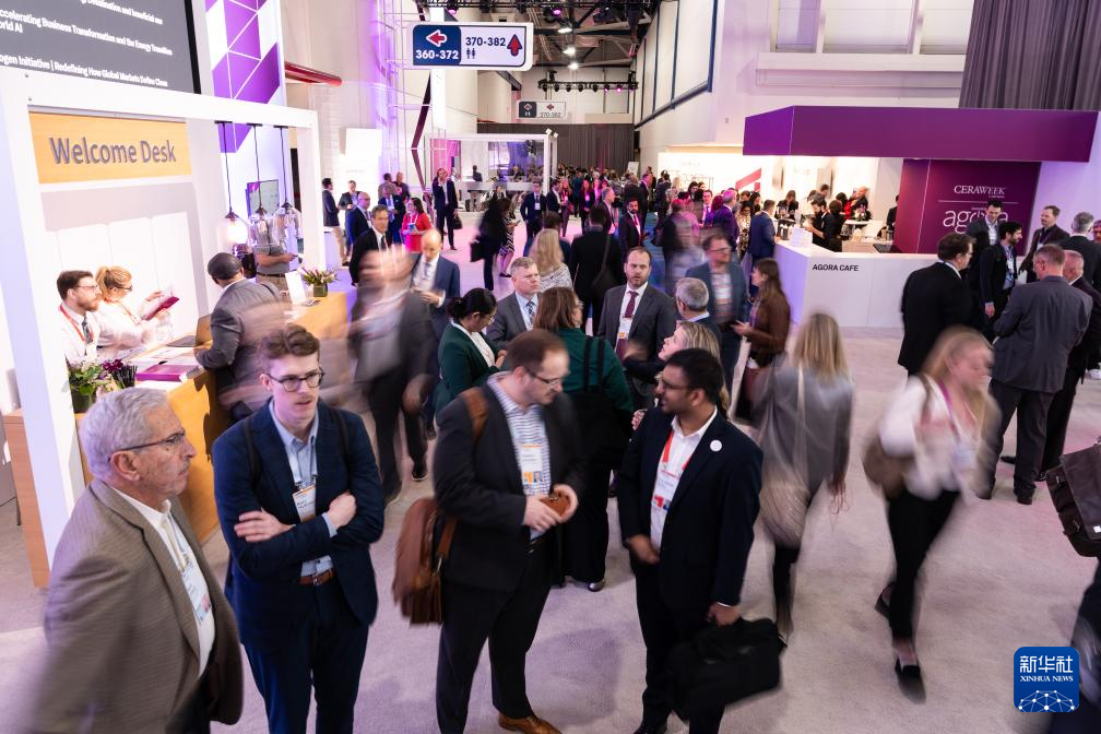 3月18日,与会者在美国休斯敦举行的能源界高端会议“剑桥能源周”的创新集市上参与宣讲活动。