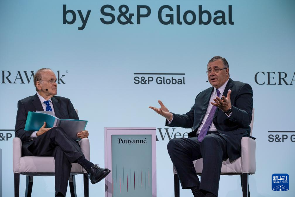 3月18日,法国道达尔能源首席执行官帕特里克·普亚纳(右)在美国休斯敦举行的能源界高端会议“剑桥能源周”上分享观点。