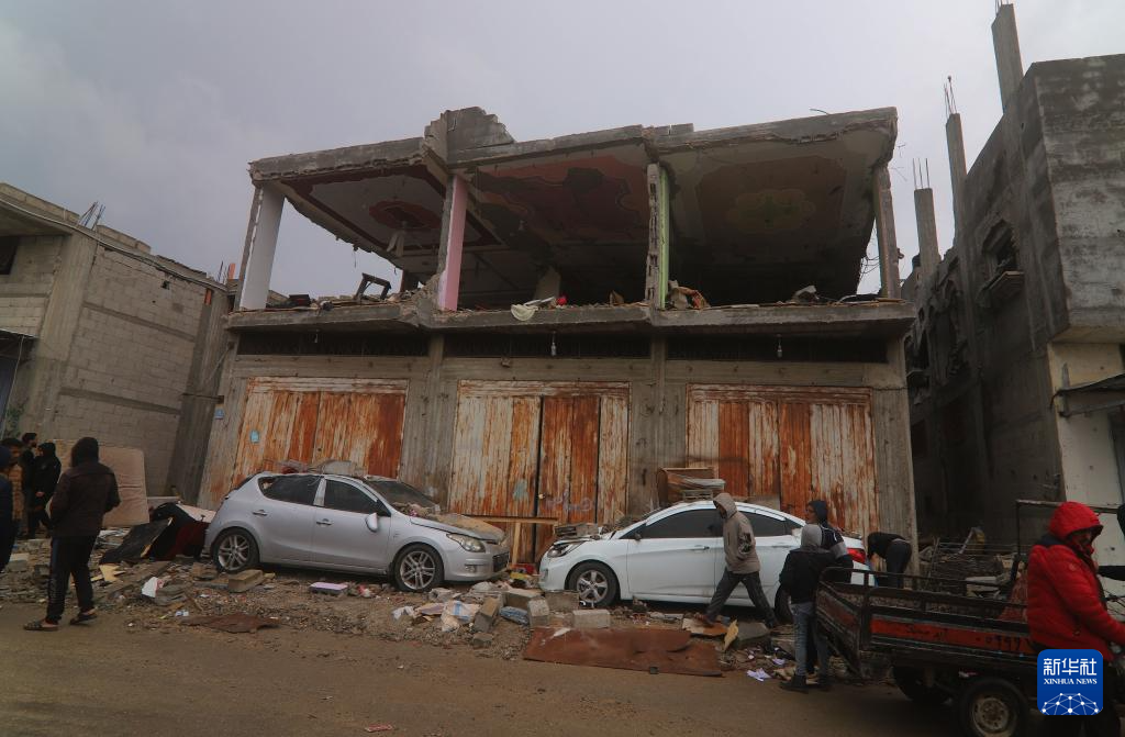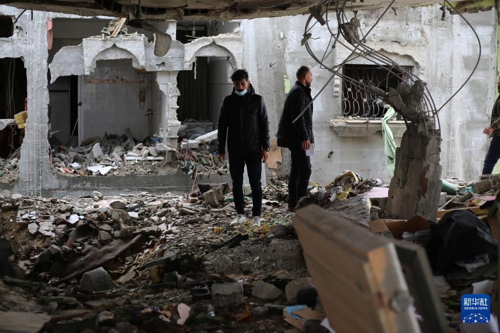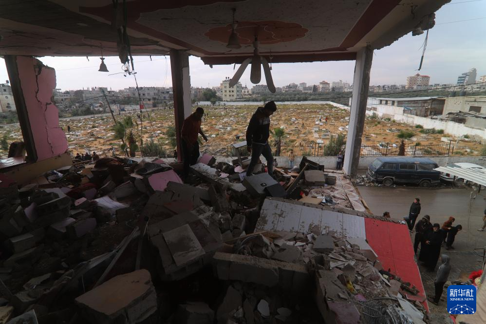 3月19日,在加沙地带南部城市拉法,人们查看以军轰炸后的建筑废墟。