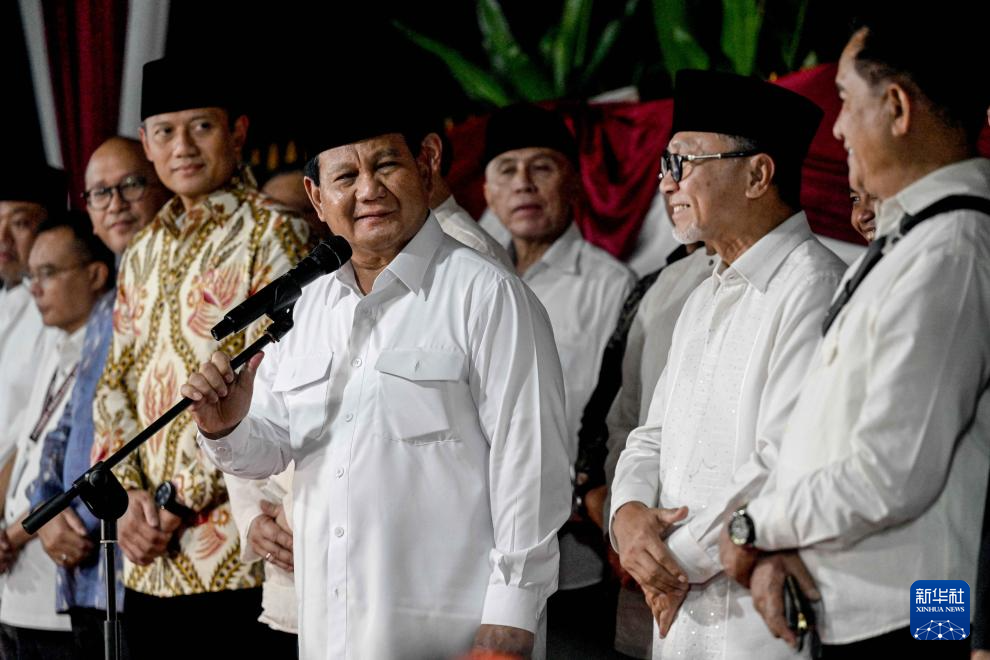 3月20日,在印度尼西亚雅加达,普拉博沃(中)出席媒体记者和支持者到场的集会。