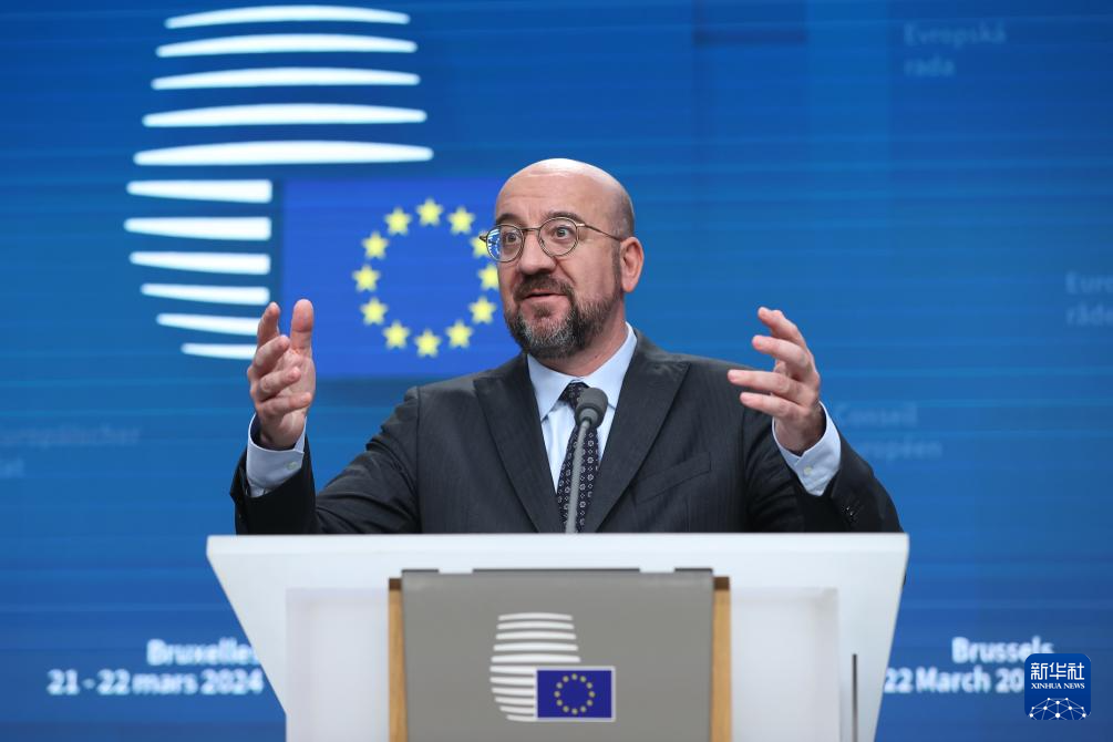 3月21日,在比利时布鲁塞尔,欧洲理事会主席米歇尔在欧盟峰会期间出席新闻发布会。
