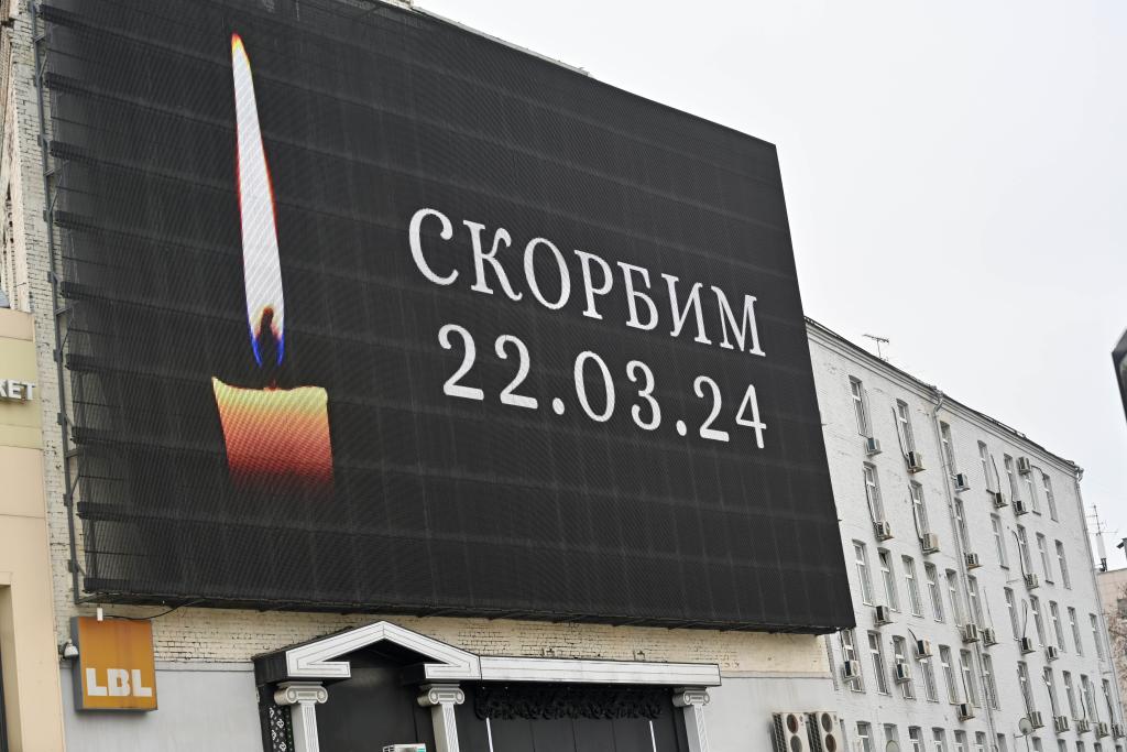 3月23日,俄罗斯首都莫斯科街头的广告牌播出蜡烛图案,悼念莫斯科近郊恐袭事件遇难者。新华社记者曹阳摄
