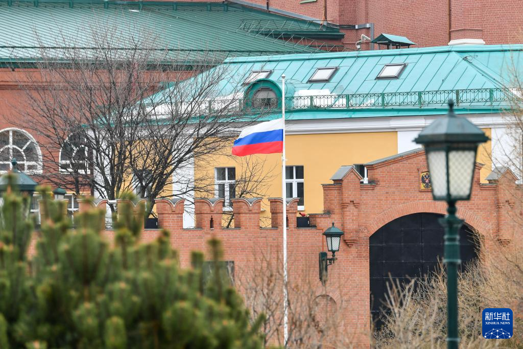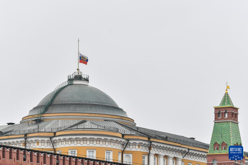 这是3月24日在俄罗斯莫斯科拍摄的降半旗的克里姆林宫。