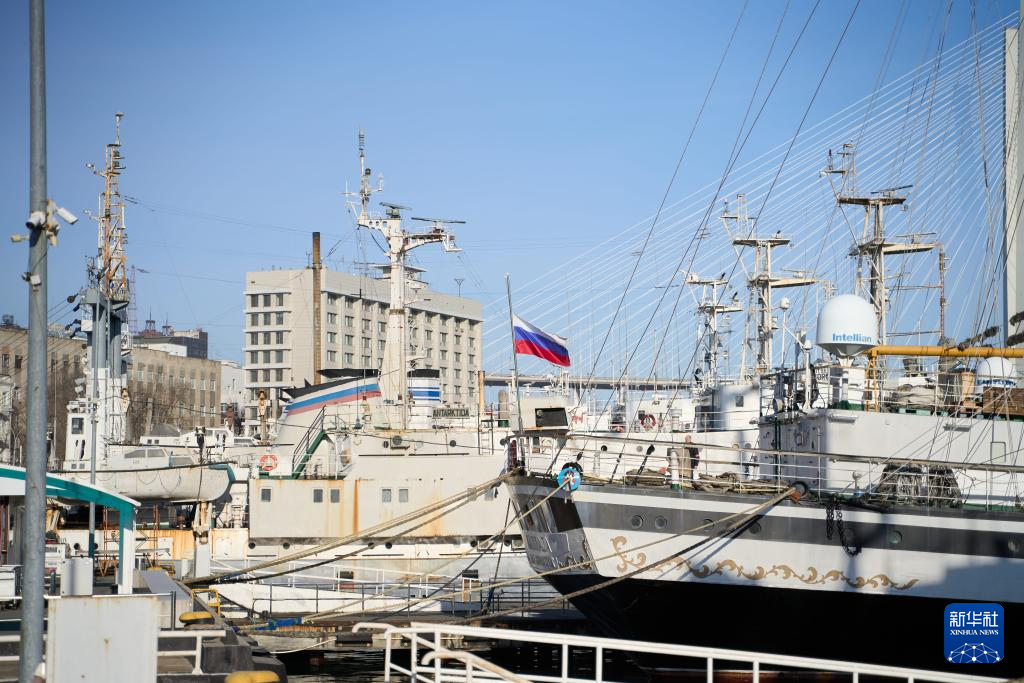 3月24日,一艘停靠在俄罗斯符拉迪沃斯托克港口的船只降半旗。