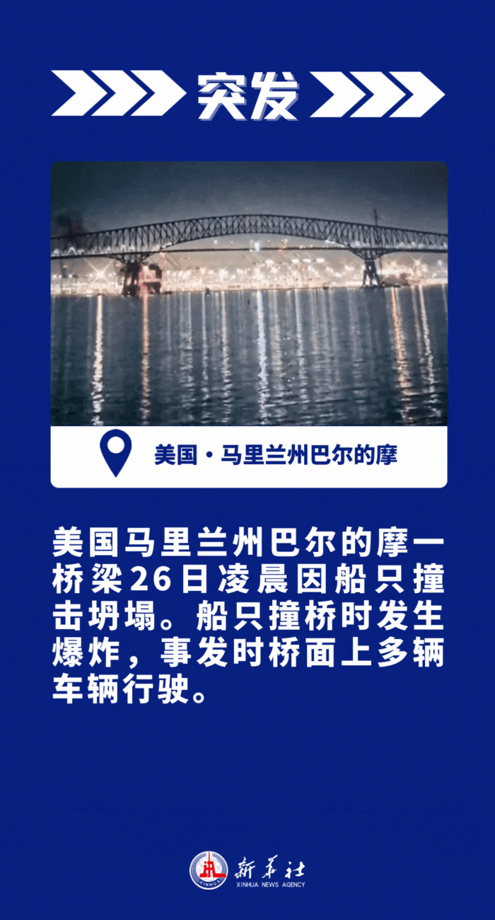 据报道,事发时,一艘货船撞上巴尔的摩“弗朗西斯·斯科特·基”桥,这座长约2.6公里的桥随后坍塌。船只撞桥时发生爆炸,事发时桥面上多辆车辆行驶。