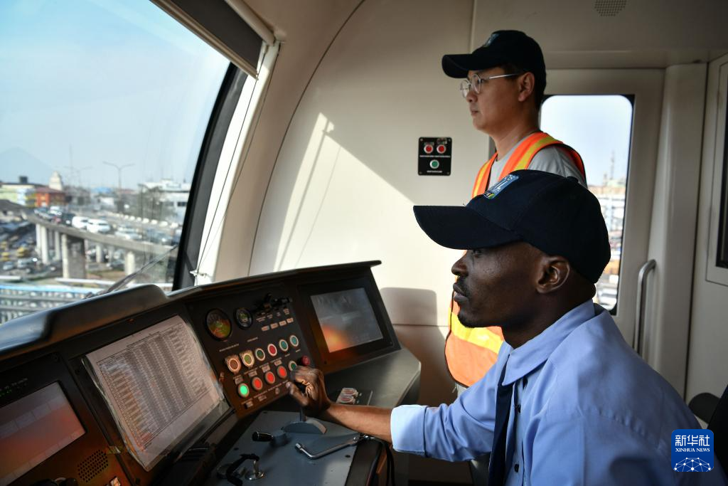 3月2日,在尼日利亚拉各斯,见习司机阿旺甘斯(前)和中国师傅王奥飞共同驾驶轻轨蓝线列车。