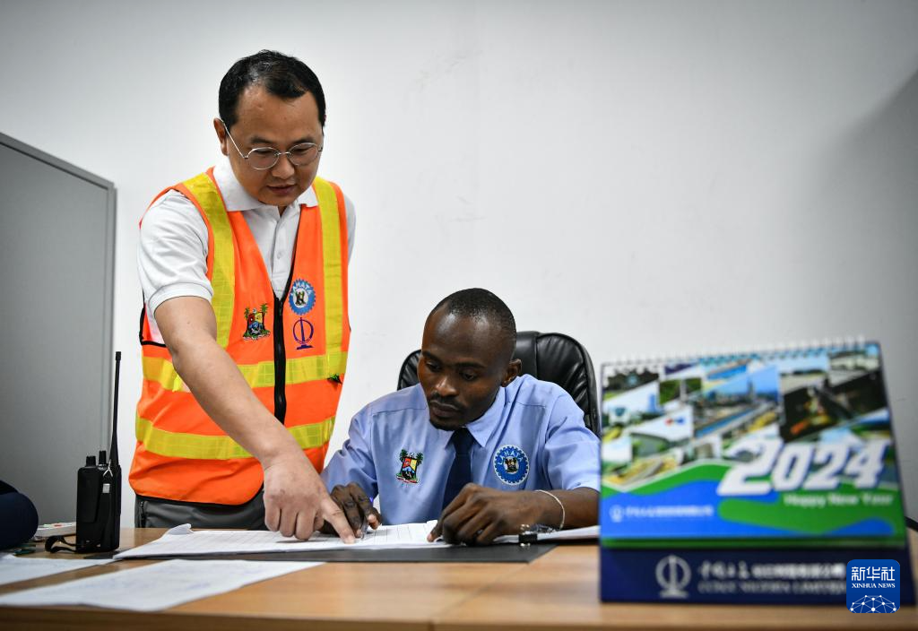 3月3日,在尼日利亚拉各斯,见习司机阿旺甘斯(右)和中国师傅王奥飞在轻轨蓝线码头站调度室记录行车数据。