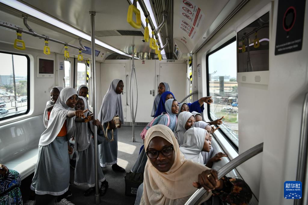 2月28日,在尼日利亚拉各斯,当地一所学校的师生们体验乘坐轻轨蓝线列车。
