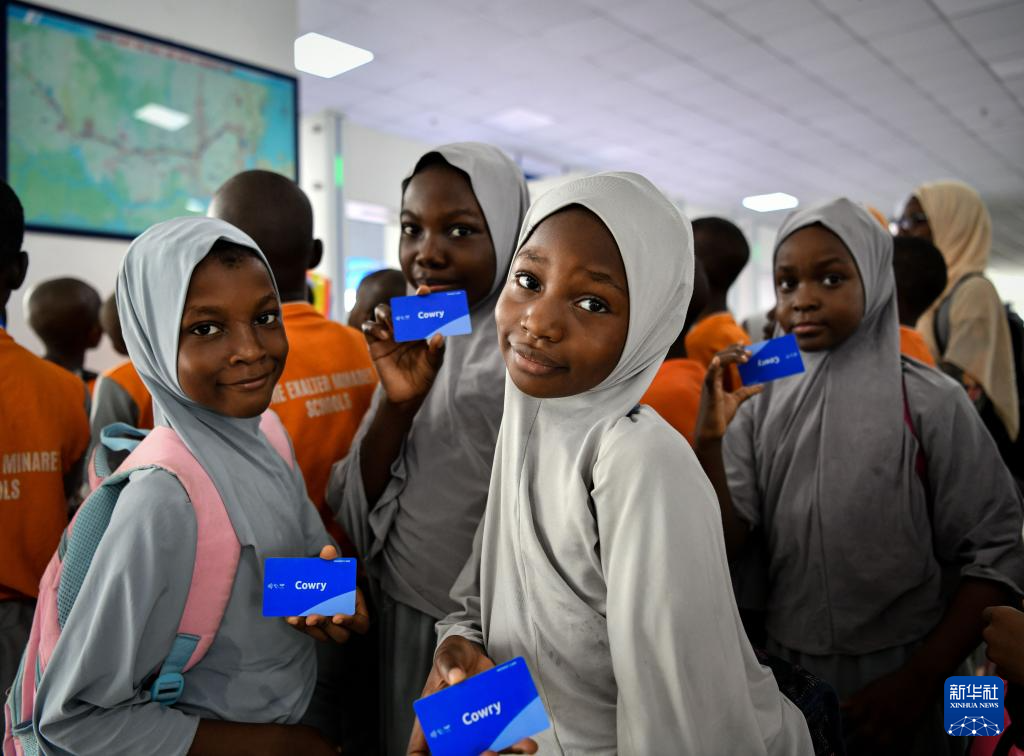 2月28日,在尼日利亚拉各斯,当地一所学校的学生们展示轻轨蓝线列车的乘车卡。