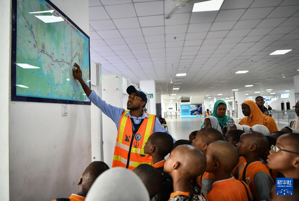 2月28日,在尼日利亚拉各斯,轻轨蓝线码头站的客运协调员为学生们讲解轻轨蓝线路线和规划图。