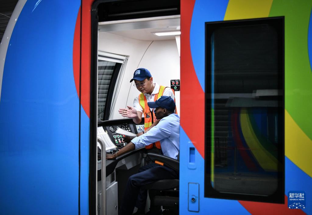 3月3日,在尼日利亚拉各斯,中国师傅王奥飞(后)在轻轨蓝线列车驾驶室指导见习司机阿旺甘斯驾驶技能。